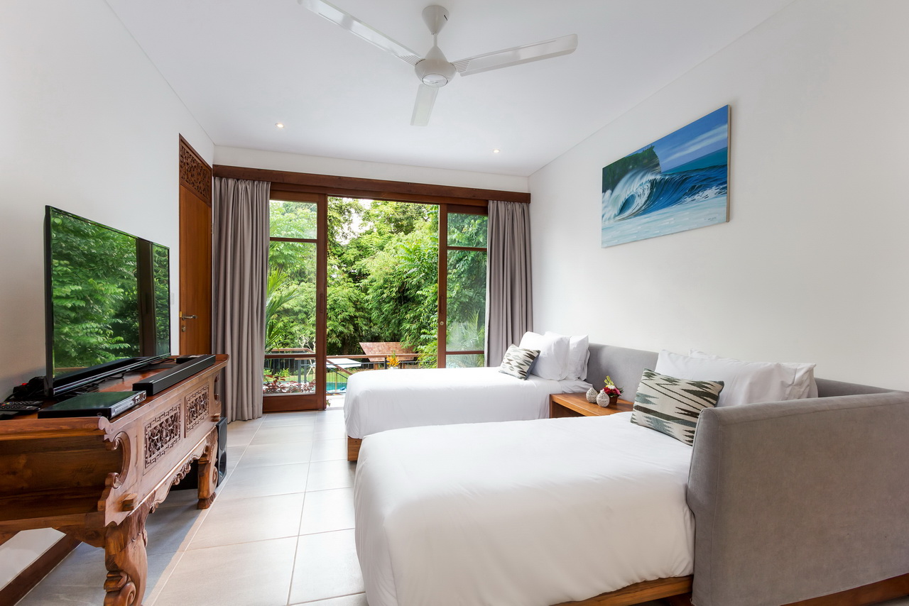 Set on 1,500 square meters (16,145 square feet) of land, the villa provides total privacy and seclusion. The guests can enjoy exclusive use of the whole villa and its modern facilities, including fully-equipped kitchen and high-speed wireless internet. The interior is decorated to a high standard with an abundance of traditional Balinese charms combined with modern convenience. All rooms feature spacious semi open-air bathrooms with bath tub and separate shower to maximize relaxing, tropical atmosphere. The villa is fully serviced by dedicated staffs, including friendly villa manager and your own butler/chef who can cook, clean and pamper their guests with five-star service.The villa comfortably accommodates up to 6 adults/ 8 guests, and babies and children are most welcome.